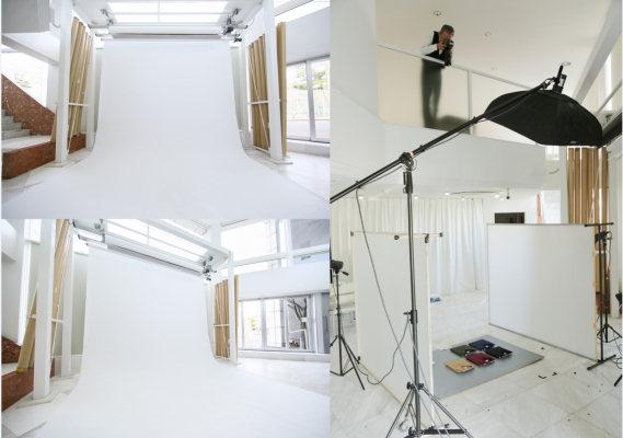 全高4.5m以上あり、モデル撮影に最適。バック紙昇降機を完備しており、コンセプトに合わせて背景を変更できる。また、2階吹抜フロアから真俯瞰の商品置き撮り撮影も可能。