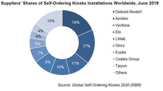 米国のテクノロジー企業Diebold Nixdorfは、世界最大のセルフオーダーキオスクサプライヤーであり、設置台数の19%を占めています。同社の最大の顧客はマクドナルドで、2万5,000台の端末を設置しています。 2位はフランスのAcrelecで、現金技術を専門とする日本のグローリー株式会社が最近80%の株式を取得しました。