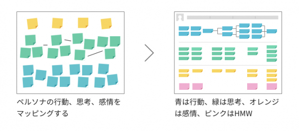 ペルソナのコミュニケーション体験を可視化し、ペルソナの行動や感情やタッチポイントを通してどのようなサービスを提供すればよいか検討します。