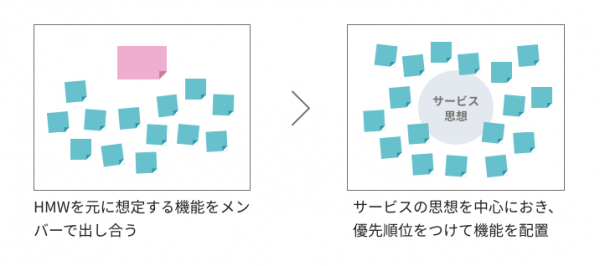 ユーザーの課題に対しHMWを考え機能を洗い出します。サービスの思想やメインとなる機能も同時に検討します。
