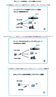 今までのシンクライアント利用ではオンライン利用環境で外部PC作業が行えました。外部USB内データをオフラインで安全に外部PC利用作業で行えます。PC内/USB内にはデータは残りません。