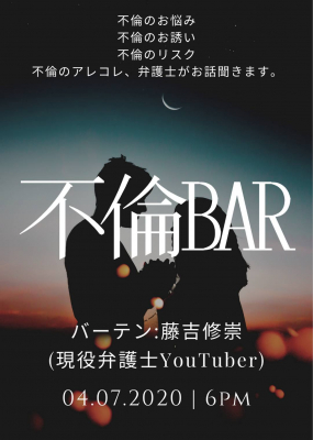普段はなかなか話しにくい不倫にまつわる話題ですが、この日は藤吉先生になんでも話せる異色のバーイベントです。現在不倫に悩んでいる方だけでなく、不倫に勧誘されている方、不倫のリスクを知りたい方のご来店をお待ちしています。「実は不倫でトラブルを抱えていて…」といった本気の打ち明け話もこの日は大歓迎。藤吉弁護士は不倫の他、ネット上の誹謗中傷の特定・削除に強い弁護士としても多数のメディアに出演実績があります。登録者28,000人以上の人気YouTuberとしても活動しています。