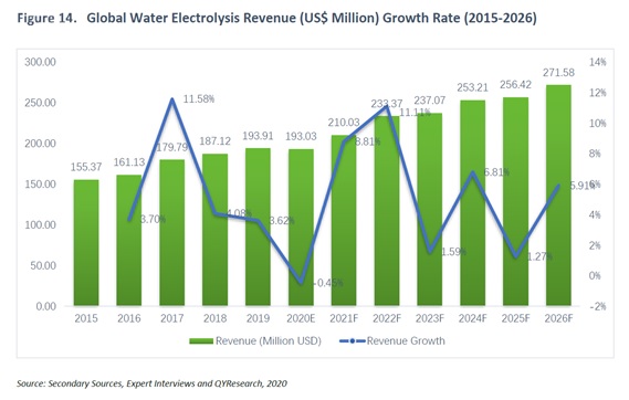 電気分解は、再生可能な資源からの水素生産のための有望なオプションです。電気分解は、電気を使用して水を水素と酸素に分解するプロセスです。この反応は電解と呼ばれる単位で起こります。電解のサイズは、小規模の分散型水素製造に適した小型のアプライアンスサイズの機器から、再生可能エネルギーまたはその他の温室効果ガスを排出しない形態に直接結び付けることができる大規模な中央生産施設までさまざまです。水電解の世界的な販売は、2015年の678台から2019年の870台に増加し、CAGRは6.43%でした。 2019年、世界の水電解市場は中国が主導しています。米国は、地域で2番目に大きい市場です。世界の水電解市場は2019年に1億9391万米ドルと評価され、2026年末までに2億7,158万米ドルに達し、2020-2026年には5.78%のCAGRで成長します。この市場には、Proton On-Site、Teledyne Energy Systems、Hydrogenics、Nel Hydrogen、Suzhou Jingli、Beijing Zhongdian、McPhy、Siemens、TianJin Mainland、Areva H2gen、Shandong Saksay Hydrogen Energyなど多くのサプライヤーがいます。これらのメーカーの中で、Proton On-Siteは最大のサプライヤーです。