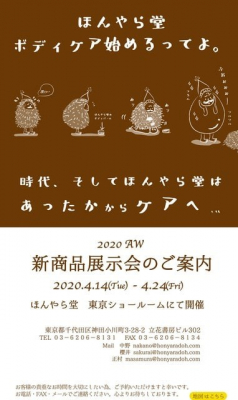 「心からほっとする健康と癒し」をコンセプトに商品を展開する株式会社ほんやら堂(本社:群馬県高崎市 代表取締役:藤永辰美)は、2020年4月14日(月)〜4月24日(金)、秋冬商品の法人顧客向け展示会を東京ショールーム(千代田区神田小川町3-28-2 立花書房ビル302)で開催します。