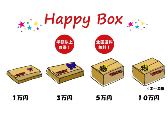 お得な「ハッピーボックス」は、価格別に1万円、3万円、5万円、10万円の4種類をご用意しました。