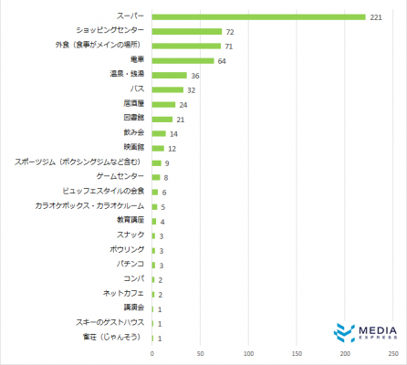 コロナウイルス感染症が流行ってからも気にせず行っている場所としては、スーパーが圧倒的に多く、ショッピングセンター、外食と続きました。