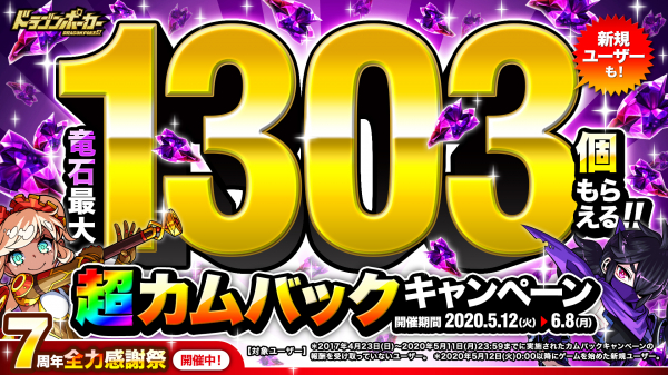5月12日(火)より久しぶりにログインするユーザーや新規ユーザーを対象に、竜石が最大1303個もらえる「超カムバックキャンペーン」を開催いたします。