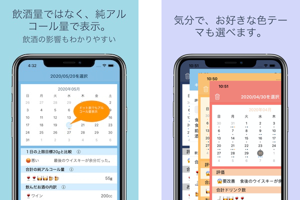 達成した日の自分へのご褒美や飲みすぎた日の戒め、減酒の決意の思いなどを表現できるように、全体色テーマや飲酒量棒グラフを多彩な選択肢から選べます。基本機能でも、酒別のアルコール濃度や上限量、カレンダーの細かな調整等々、ユーザーの好みでカスタマイズ可能です。