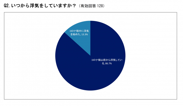 またQ2 についてはコロナ禍の最中に不倫に発展した人も13.3%となっており、一部の人にとってはコロナ禍であろうとも盛り上がった愛人への想いは止められない実態が浮き彫りとなっています。