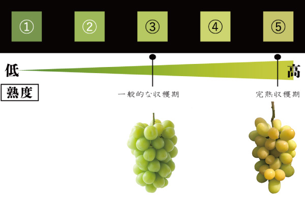 ネーミングこそ大人シャインマスカットですが、子供がとにかくやみつきになる甘さです。「黄色」のシャインマスカットが甘いことを知っている生産地の子どもたちは黄色を選んで食べています。シャインマスカットは完熟すると皆様が普段目にしている鮮やかな緑のシャインマスカットと違い、【黄色み】を帯びた落ち着いた色合いに変化します。緑のものがさっぱりとした甘さなのに対して、濃厚な甘みです。糖度18度前後を基準として収穫されるシャインマスカットですが、通常市場に出荷するためには美味しさは当然のことながら、見栄えも重要視されるために一般的には下記のようなカラーチャートなどにより、収穫は(3)の色を目安に行われます。一方、(5)の色で完熟収穫されたものは糖度19度、場合によっては20度を超える甘さとなります。