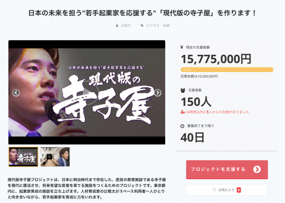 将来有望な若者を育成する施設「現代版の寺子屋」はオープンに向けた資金集めのため、国内最大クラウドファンディングサイト「CAMP FIRE」にて2020年6月7日18時にプロジェクトを開始しました。支援募集期間は6月7日(日)18時から同年7月19日(日)までの期間で、目標金額は1000万円でしたが、開始24時間で100名を超える支援を集め、目標金額となる10,000,000円を達成しました。プロジェクトは現在もクラウドファンディングサイト「CAMP FIRE」上で継続中です。