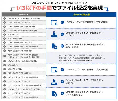 株式会社プロット(本社:大阪市北区、代表取締役社長:津島 裕)は、ネットワーク分離環境内でのファイル授受・無害化を行う「Smooth File ネットワーク分離モデル」に、LGWAN接続環境から直接外部との安全なファイル授受を実現する新機能を実装し、2020年10月よりマイナーバージョンアップ版として出荷開始することを本日発表いたします。