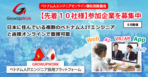 株式会社One Technology Japanはベトナム人エンジニア採用支援サイトGROWUPWORKを運営しています。この度は外国人採用に興味のある企業様を7月17日(金)より募集いたします。