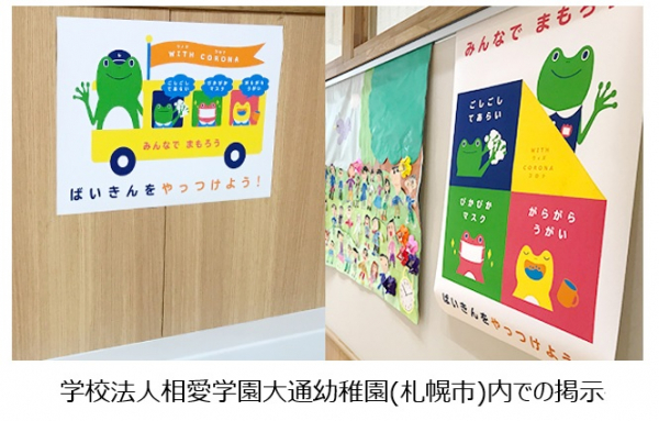 当デザイン『ニューノーマル・カエルシリーズ』は、学校法人相愛学園大通幼稚園(札幌市)では園内のポスターとして、また札幌市立中央中学校では全校生徒と保護者向けの感染症対策用冊子のデザインとして採用いただきました。ほかにも、埼玉県川口市役所ではポスターを無料配布し、商店街の約2,000店の店頭で掲示されたり、大分県の自治体では市報の表紙に採用されたりなど、全国各地に広まり、感染防止マナーの啓発に貢献しています。