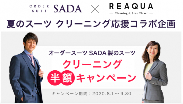 自宅にいながら手軽にご利用いただける宅配クリーニング「リアクア」は、期間中にクーポンコード【SADA2020】を入力してリアクアの衣類クリーニングにお申込みいただくことで、マシーンメイドのフルオーダースーツを取り扱うオーダースーツSADA製のスーツ限定で、クリーニング料金が半額になるキャンペーンを実施します。