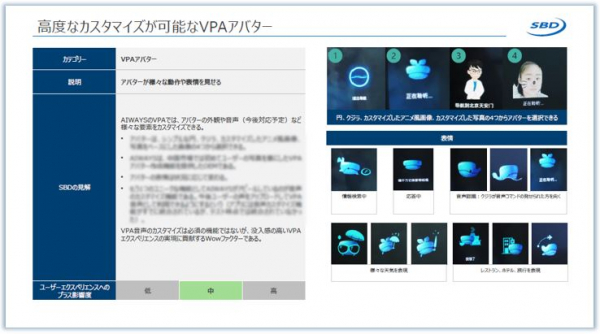 VPAは同システムのハイライトであり、位置検出、ナビゲーションやインフォテインメントコントロールなどの機能の「常時オン」、各種音声コマンド向けに設計されたアニメーションなど、さまざまなインテリジェント機能を提供します。アバターは、標準設定されている「クジラ」のほか、カスタマイズしたアニメ風キャラクターや、自分の写真(および将来的には自分の声)を使用することも可能です。