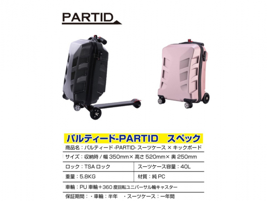 PARTIDパルティードの正規販売代理店である株式会社Matelia (本社: 神奈川県横浜市、代表取締役CEO: 田村 りょう)は、3秒でスーツケースがキックボード!?旅行の移動をエキサイティングに!PARTIDを、クラウドファンディングサイト「Makuake」にて、2020年7月23日より先行販売を開始いたしました!