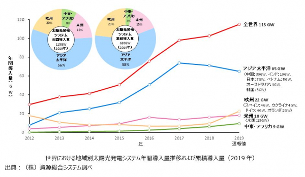 世界の太陽光発電市場は、2010年代前半の10GW規模から、フィードイン・タリフを中心とする各国政府主導の普及インセンティブと、プロジェクト入札による市場原理の導入により100GW規模へと急拡大しています。2019年は世界最大の中国市場が縮小したにもかかわらず、米国、インド、日本などの主要市場に加え、前年から倍増した欧州市場など、その他の国・地域の市場拡大により、年間導入量は100GW台を維持、累積導入量は600GWに達しました。