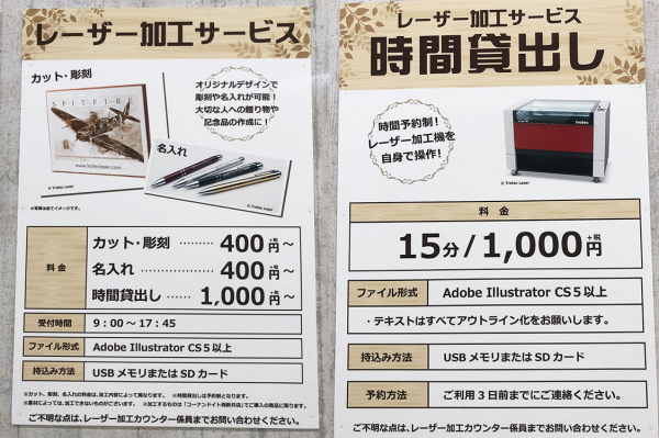 コーナンドイトでは、「サイクルプラザ」のボードをレーザー加工機で制作する等、お客様へのレーザー加工サービスだけでなく、店内の看板・ディスプレイ制作にも活用されています。