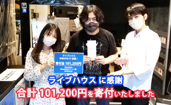 寄付金は、「Neontetra」のグッズやニューシングルの収益に加え、4月に中止となった「Neontetra公演in渋谷GUILTY」のチケットを、返金ではなく、本企画に賛同しNeontetraグッズと引き換えてくださったファンの方のチケット代金を合算いたしました。