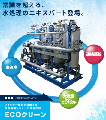 ECOクリーンは工事濁水や工場排水を濾過再生し、循環利用を可能にするMF濁水処理装置。清澄度は水道水レベルで、一般的なMF(中空糸・平膜)に比べ通水処理量が10倍、許容濁度も10倍と圧倒的な性能。独自のフィルター目詰まり制御により連続自動運転が可能。これまで一般的に採用されている凝集沈殿方式や砂濾過に比べ、ランニングコストを1/10、設置スペースも1/10に削減した。フィルターの寿命は2年〜4年で、交換は10分で可能。フィルターの再生サービスも行う。特許10件を取得済み、2件を出願中。