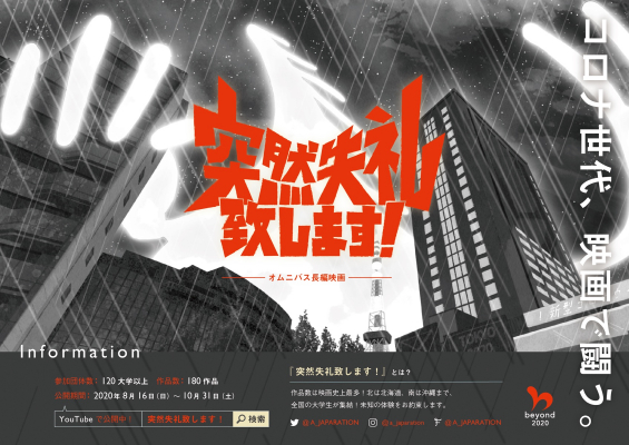 2020年上旬、コロナウイルスの感染が拡大し、創作においても課外活動の自粛を余儀なくされました。そんな中、ある大学生が発した「突然失礼致します!」という一言が、コロナウイルスに活動を阻まれた、映像文化に携わる全国の大学生を動かしました。