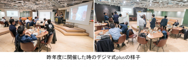 「デジマ式 plus」は、地域課題を当事者自らプレゼンテーションし、参加企業がビジネスによる課題解決プランを検討・発表するワークショップです。単なるワークショップにとどまらず、双方の要望がマッチングして、実際に地域課題解決型ビジネスとして事業化することを目的としています。