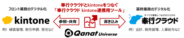 今回発表する「奉行クラウド kintone連携用ツール」は、JBATのクラウド連携プラットフォーム「Qanat Universe」を活用し、奉行クラウドとkintoneをつなぐ連携ツールです。例えば、kintoneで営業案件の進捗を管理し、受注できたらそのデータを奉行クラウドに自動で連携させ、販売管理業務につなげることができます。これまで“kintoneによる案件管理”、“奉行クラウドによる販売管理”として、別々に処理していたものが自動連携することで、業務の生産性を大幅に向上させることが可能です。