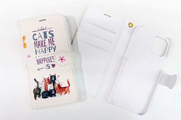 手帳型ケースは、背面だけでなく全面を保護できるためカバンのなかに入れても液晶画面が他のものにぶつかる心配がなく、キズや画面割れを防いでくれます。スマホと一緒に持っておきたい定期やポイントカードなどカードが3枚も入るポケットのほか、メモ用紙などを入れておけるポケットもついているので機能性もバッチリです。背表紙には嬉しいストラップ穴付きです。プリントはベルト部分にも可能です。
