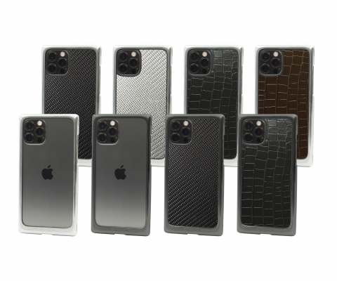 バンパーのカラーは、シャイニーシルバーとブラックの2色。本体はジュラルミンの塊からの削り出しで、手仕上げで磨き上げます。フルカバージャケットのバックパネルは、リアルカーボンファイバー(シルバー、ブラック)とクロコ型押し天然牛革(ブラック、ブラウン)。