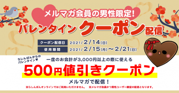 バレンタインデーとなる2021年2月14日(日)に、らしんばんのメールマガジンにご登録いただいている男性のお客様限定で、バレンタインクーポンをプレゼントいたします。