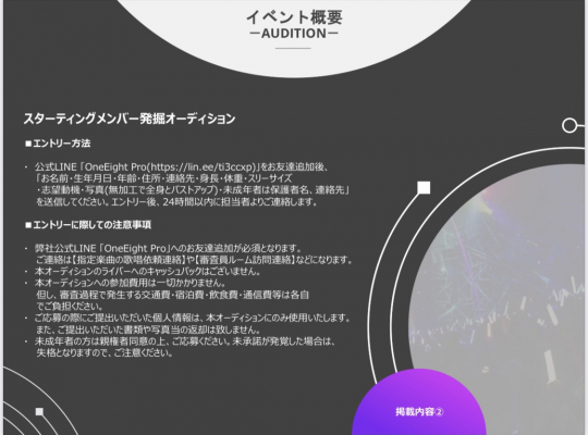 ・ご応募の際にご提出いただいた個人情報は、本オーディションにのみ使用いたします。