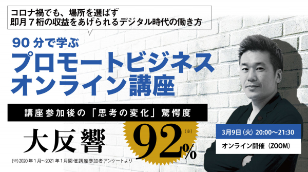 「〜コロナ禍でも、場所を選ばず即月7桁の収益を上げられるデジタル時代の働き方〜90分で学ぶプロモートビジネスオンライン講座」です。
