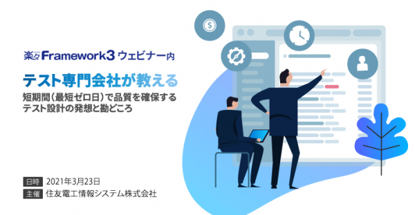 ソフトウェアのテスト・品質向上支援に関するサービスを提供するバルテス株式会社(本社:大阪市西区、東京都千代田区 代表取締役社長:田中 真史、以下当社)は、住友電工情報システム株式会社(本社:大阪市淀川区、代表取締役社長:奈良橋 三郎、以下「住友電工情報システム」)が主催の無料ウェビナー『楽々Framework3(※)ウェビナー』内で、「短期間で品質を確保するテスト設計の発想と勘どころ」について2021年3月23日(火)に講演いたします。