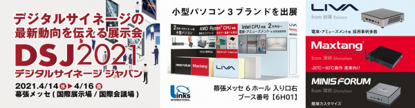リンクスインターナショナルが幕張メッセで開催される「デジタルサイネージジャパン2021」へ小型パソコン3ブランド「LIVA」「Maxtang」「MINISFORUM」を出展