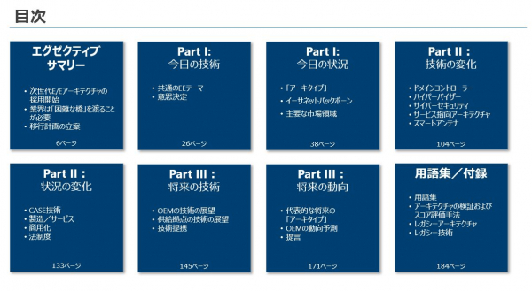 エグゼクティブサマリー:E/Eアーキテクチャの進化、CASEエクスペリエンスを提供するE/Eアーキテクチャ、業界のCASE対応を支える技術、サービス指向アーキテクチャへの移行に必要な選択などE/Eアーキテクチャにおける最新動向、変化、将来の展望の要点をまとめています。