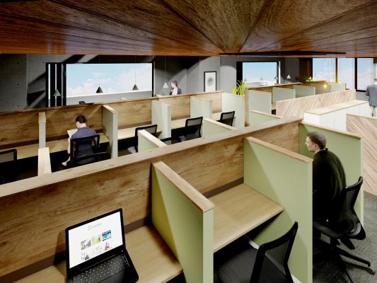 コワーキングスペースは、間仕切りを効果的に配置し、一人で集中して作業が出来るよう「個」を意識したレイアウトになっています。また、丹沢山地の借景を生かしたレイアウトで、休憩時には緑を眺めながらリラックスでき、メリハリをつけたはたらき方をサポートします。