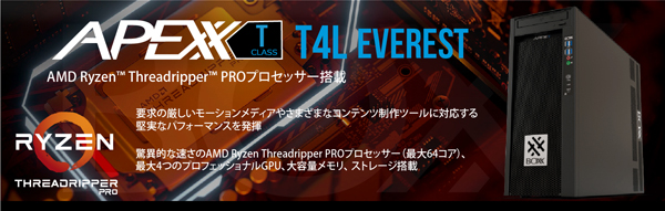 「APEXX T4L」に搭載されたAMD Ryzen Threadripper PROは、プロセッシングコアの数と革新的な機能によって、VFXアーティスト、アニメーター、モーションメディアエディター、さらにはアーキテクトやエンジニアが、これまで以上に迅速に制作することを可能にします。