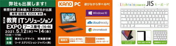ブースでは、iPad用 JIS配列日本語かな印字キーボード「Lightning KANA-JIS Keyboard」や、遊びながら学べる学習用 2in1 タブレットPC「Kano PC」などを出展いたします。実機も展示いたしますので皆様のご来場をお待ちしております。