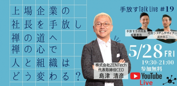 最先端の組織や経営スタイルの研究と組織のアップデート支援を手がける手放す経営ラボラトリー(運営会社株式会社ブレスカンパニー)は、【手放すTALK LIVE#19】『上場企業の社長を手放し、禅の道へ。 禅の心で人と組織はどう変わる?』- を令和3年5月28日19時半からオンラインで無料開催します。