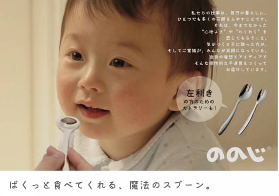 において、カトラリー・学校給食器具・キッチン用品などのオリジナル商品を開発している、ののじ株式会社(横浜市西区、代表取締役 ?部夢宙)、株式会社兵左衛門(福井県小浜市、代表取締役社長 浦谷剛人)広尾直営店とコラボイベントを行います。ののじが開発した持ち易さ、すくい易さ、食べ易さ、唇へのフィット感を極めたカトラリーの中でも、珍しい「左利き」用、および赤ちゃんがパクパク食べてくれる人気の「離乳食スプーン」、また兵左衛門がプロ野球などで折れたバットをリサイクルする「かっとばし!!プロジェクト」の12球団の箸にフォーカスして、それらがセットしやすくデザインされた新製品との使用シーンとともに御紹介いたします。