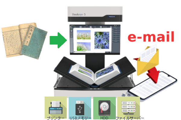 また”本に優しいだけじゃない”をコンセプトにPostscript対応の複合機/プリンターへの印刷に加え、改正著作権法を踏まえた、複写データのメール添付による送信、USBメモリーやファイルサーバーへの出力などデータ出力機能が強化されています。
