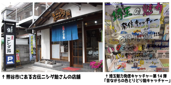 この埼玉魅力発信キャッチャー第14弾の【昔ながらの色とりどり飴キャッチャー】は、1928年創業で当時はお菓子全般を製造・販売しており、熊谷空襲(1945年8月15日)でお店を焼かれ移転を経て、現在の飴専門店となった、100年近く手づくり飴を作り続けている、古伝ニシダ飴さん(住所:埼玉県熊谷市中西1-1-16)の昔のながらの手づくり飴を景品に採用した、埼玉県の魅力を1人でも多くの方に知ってもらえたらとの想いで登場したクレーンゲームです。