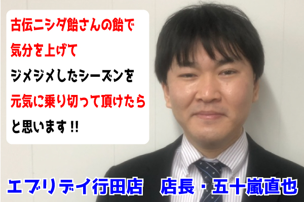 今回、この台を作製した当社、エブリデイ行田店の店長・五十嵐直也によると、「6月は梅雨の時期で、雨が多くなり、晴れの日に比べ、雨だとどうしても気分が下がり気味になってしまうので、何か気分を上げるものはないかと考えていたところ、“雨”が“アメ”に変わり“飴”に変換され、美味しくて見てても楽しい気分になる古伝ニシダ飴さんの色とりどりな飴にたどり着いた。梅雨入りで雨が多くなるが、古伝ニシダ飴さんの飴で、気分を上げて、ジメジメしたシーズンを元気に乗り切って欲しい。」とのこと。