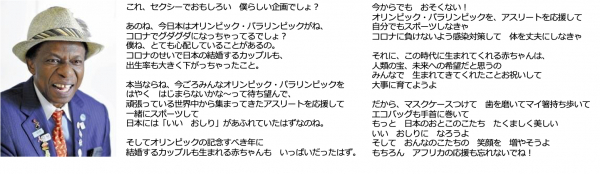 日本のみなさん どうか感染予防をおこたらず「くらしといのち」を守り、まもなく始まる東京オリンピック・パラリンピック、そして頑張っているアスリートを応援しましょう。自らもスポーツをして健康に、「いい おしり」になりましょう。そして、アフリカを支援してください。「平和を愛するアフリカ人」オスマン・サンコンはそう祈っています。