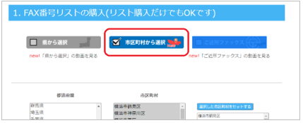 「市区町村から検索」は、市区町村単位で法人FAX番号データを検索・購入できる機能です。