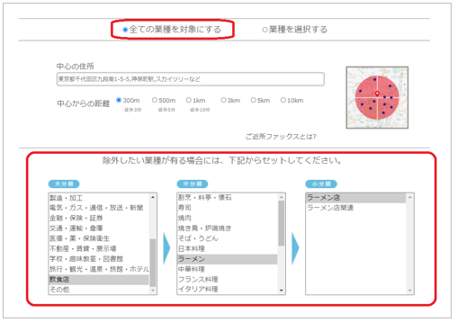 「業種除外」は、中心住所から指定範囲内の法人FAX番号データを検索・購入できる「ご近所ファックス」で、全ての業種を対象としているときに、除外したい業種を選択してデータを検索・抽出できる機能です。