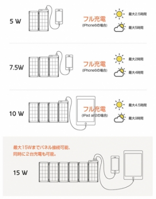 パネルは本体を含め最大6枚(2.5W×6枚=15W)まで可能です。