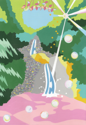 ふだん目にしている普通の日常世界をまるで夢空間の絶景のように蒸留してしまう松尾たいこ氏の絵画世界。アクリル絵具のクリーミーな筆触と発色の美しさが特徴的です。グラデーションを排したカラフルな塗りの味わい、デザイン感覚にあふれる色彩設計で生き生きとした躍動を生み出しつつ、それらと表裏一体の深い闇をも画中にかいま見せる、そんな優れた構想力がいつも絵の中に輝いています。