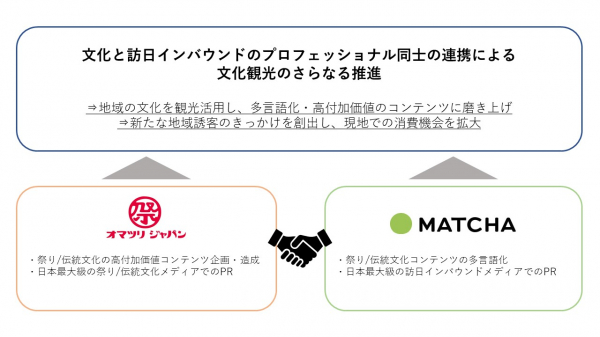 祭り・伝統文化に強みをもつオマツリジャパンと、訪日インバウンド分野に強みをもつMATCHAが連携をすることで、祭りや伝統芸能に関する地域の文化を観光活用し、高付加価値、および多言語化したコンテンツに磨き上げ、新たな地域誘客のきっかけを創出してまいります。